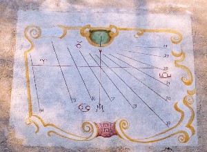 Verificato lo stato di conservazione della superficie da restaurare, che non presentava particolari difetti di adesione e coesione, si è proceduto ad una prima fase di spolveratura con pennelli a setole morbide e di pulitura a secco con spugne Wishab. I piccoli distacchi sono stati consolidati mediante iniezioni di emulsione acrilica in soluzione acquosa (Acril dal IO al 15%). Il risanamento della grande fessura verticale è stato eseguito rimuovendo a scalpello i precedenti tamponamenti decoesi e riempiendo la cavità con malta a base di calce Lafarge, sabbia vagliata (dosi 1:3) e frammenti di mattoni. La finitura è stata realizzata con intonachino a base di grassello di calce, polvere di marmo e sabbia Ticino della stessa granulometria dell'intonaco originale (dosi 1:2). Le sigi1lature delle restanti piccole lacune e delle abrasioni principali sono state eseguite con il medesimo intonachino, con una piccola aggiunta di calce Lafarge. II momento successivo è consistito nel fissaggio della superficie con prodotto a base di silicato di potassio (Special Fixativ Keim), diluito in acqua. La fase dell'integrazione pittorica ha riguardato dapprima il fondo, la cui tinta chiara e stata ripresa solo nelle zone abrase, al fine di lasciare in luce l'originale. In un secondo momento è stato possibile riprendere, seguendo le tracce delle incisioni esistenti, le linee orarie della meridiana e, successivamente, ricostruire l'impianto decorativo, il più possibile fedele all' originale, deducendolo sempre da incisioni e frammenti di colore. Il tutto è stato eseguito a ve1atura, utilizzando colori ai silicati della Keim Granital. Per permettere la lettura oraria della meridiana, è stato poi necessario posizionare lo gnomone, effettuando misurazioni e verifiche, sotto il controllo del sig. Mocchetti della Pro Loco (realizzatore dei calcoli). Per lo stesso fine sono state aggiunte linee, numeri e segni zodiacali, al fine di poter dare una miglior lettura nella sua totalità. Completate tutte le lavorazioni, per garantire una maggior durata dell'intervento nel tempo, è seguita la stesura a pennello del protettivo utilizzando Wacher 290 diluito in apposito solvente.